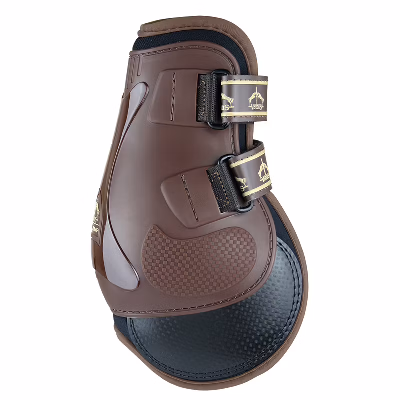 Anatomiskt utformade bakbensskydd med skal i polyuretanplast och 6 mm tjock neoprene-stoppning, kardborreknäppning.