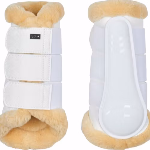 Snygg mjuk dressyrdamask fodrad med fårskinnsimitation. Damasken har tre breda kardborrestängningar för att sitta stadigt på plats på hästens ben. Extra förstärkning på insidan för att skydda hästens ben mot slag.