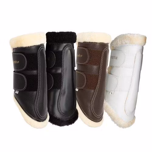 Benskydd i konstläder med insida av syntetpäls, kraftig elastisk kardborreknäppning. Passar både fram- och bakben. Maskintvättas i 40 grader. 2-pack.