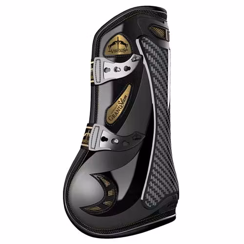 Veredus Grand Slam Carbon Gel Front För att uppmärksamma Veredus teamryttare Scott Brash, som vann Rolex Grand Slam, så har Veredus tagit fram en specialupplaga av sitt populära Carbon Gel-skydd! Ett högteknologiskt skydd med snygga guldfärgade detaljer! Skyddet är extremt 'slimmat' och sitter som 'handen i handsken' på hästens ben. - Skalet är anatomiskt utformat för att ge maximal frihet för kota och knä. Formen ger maximal bekvämlighet och passar perfekt över hästens senor - Skalet är sammansatt av två separata delar, med olika tjockhet och böjbarhet. Huvudskalet är samansatt av semi-hård polyuretan och det bakre X-formade skalet är hårt polyuretan. - X-skalet är täckt av kolfiber vilket är ett extremt tåligt, skyddande, lätt och stötdämpande material. Över kolfiberskalet ligger en 3mm nitrexgel-hinna, vilket är stötdämpande och ger hög bekvämlighet. - Ett tunt lager kolfiber med gel överdrag är inlagt i området runt kotan, eftersom det området i större utsträckning är utsatt för slag och strykningar. - Insida i neopren. - Två elastiska remmar med knappknäppning ger perfekt stängning och förhindrar 'överbelastning' på grund av för hårt åtdragna remmar. Det gör även att skydden är lätta att ta av och sätta på.
