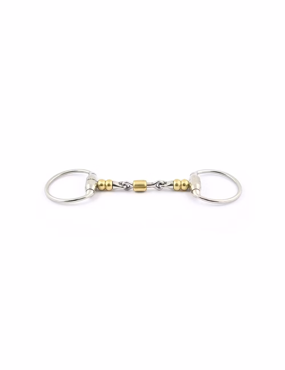 Composition: Eggbutt bit with 70 mm rings and standard 17 mm thick cannons made of Stainless Steel and German Silver (65% copper, 23% zinc, 12% nickel, a relaxing and solid alloy).