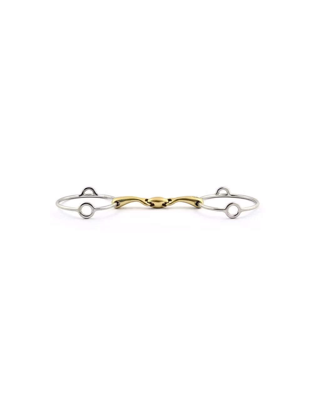 Composition: Gag bit with 90 mm large rings and standard 17 mm thick cannons made of German Silver (65% copper, 23% zinc, 12% nickel) a relaxing and solid alloy.