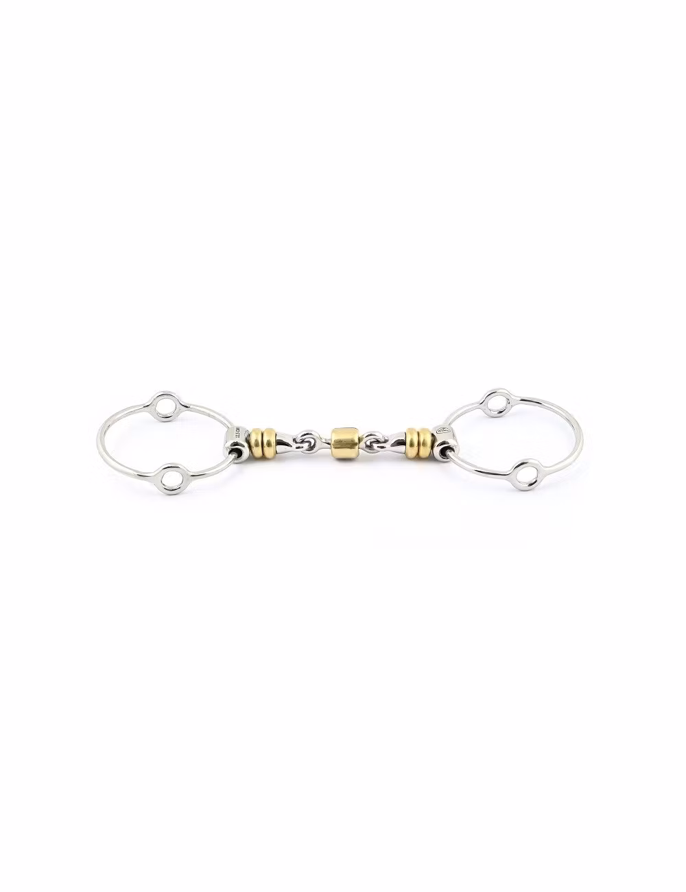Composition: Gag bit with 90 mm large rings and standard 17 mm thick cannons made of German Silver (65% copper, 23% zinc, 12% nickel) a relaxing and solid alloy.