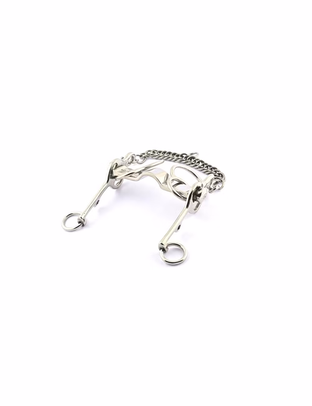 Effect: the Swales bit has some similarities with the Pelham bit but the horse doesn't feel any pressure on the neck because there is no action on the bridle cheek pieces. It is the only bit with a lever action that doesn't put any pressure on the horse's neck. It is used with a single pair of reins and a curb chain and it is less restricting than a Pelham bit as it does not have any action on the head/neck angle.