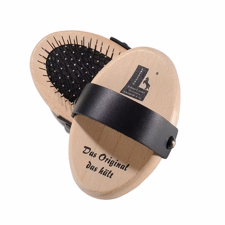 Man och svansborste med rostfria piggar. Helt suverän för att reda ut trassliga svansar och manar på ett skonsamt sätt! Att använda en bra borste är mycket viktigt då det tar flera år för tagelstrån att växa ut igen. För en tunnare svans är användningen av stålnålar utan knoppar bättre då den glider bättre genom håret. Vi rekommenderar att man i förväg använder en högkvalitativ svans och pälsglans. Tillverkad i miljövänligt vattenlackerat bokträ med antibakteriell effekt och en behaglig känsla i handen, även i mycket svala temperaturer.Läderremmen av hög kvalitet är fastnitad för hand. Om man vill kan man lossa dessa nitar och förkorta remmen till önskad storlek.