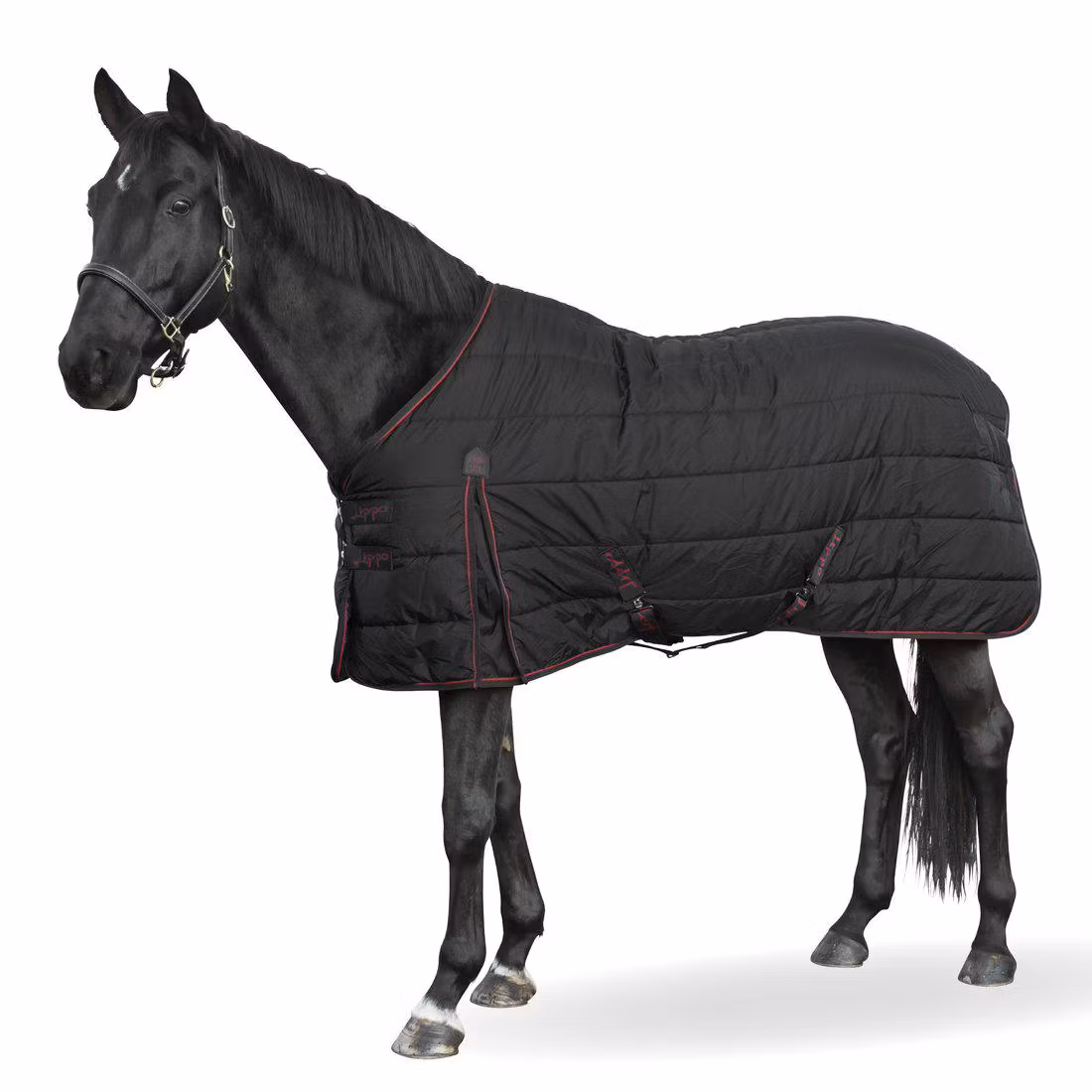 Quiltat stalltäcke i 600D med ripstop. Dubbla bogspännen, kryssgjordar och svansrem. Nylonfoder med polyesterfyllning. 115-165 cm har fästen för lösa halsar som säljes separat.