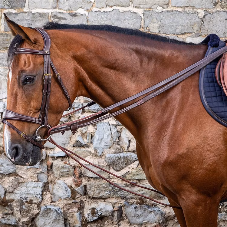 Bred gramantygel i läder med rep vilket glider lätt genom bettringarna. Tillverkad i fint spanskt läder med mässingsspännen och vit mönstersöm.