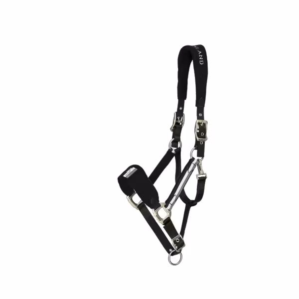 Nylongrimma med fleecevadderad nos och nackband. Trefärgat band på båda sidor. Företagets logotyp i silikon på nosgrimman. Kingsland-broderi på nackbandet. Tyg: 100% NYLON