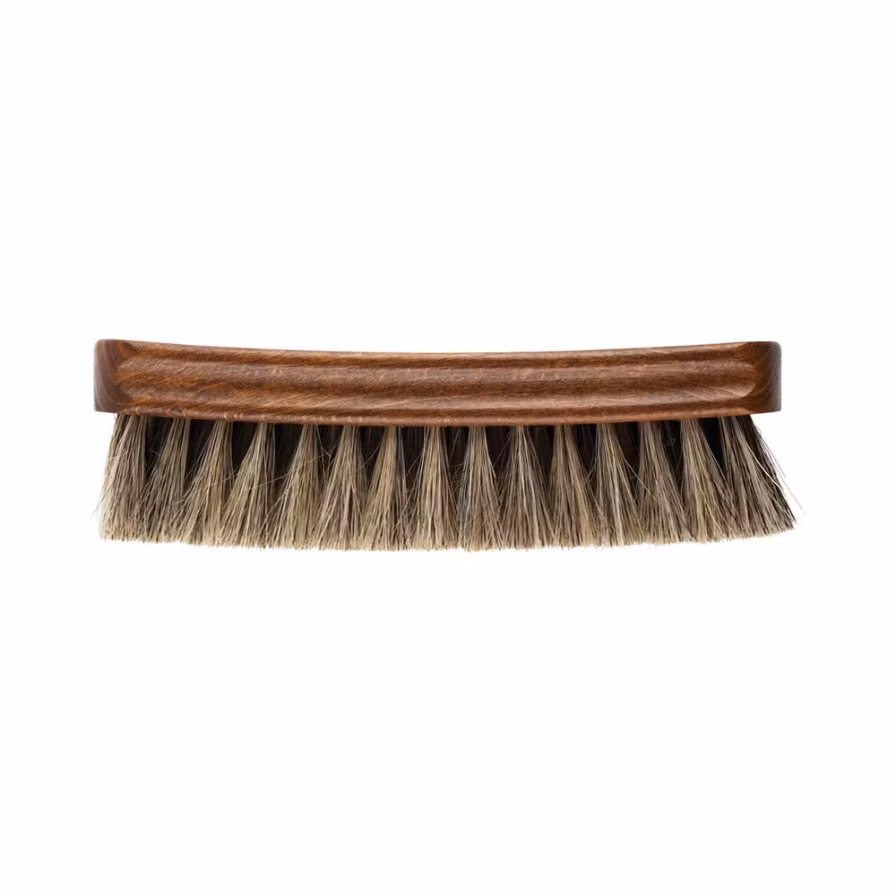 Exklusiv skoborste av mycket hög kvalitet för polering av blankt läder. Handtag av greppvänligt trä och tät borst tillverkad av 100% hästtagel. 14cm.
