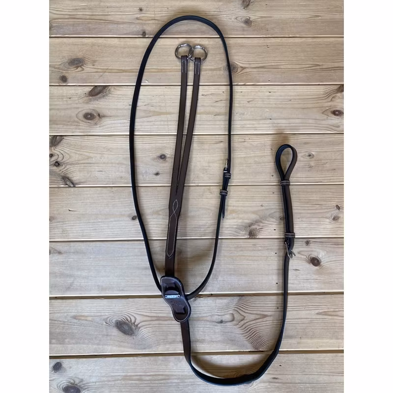 The running martingale from the Jump'In One Collection is used so the horse doesn't come above the rider's hand. It is enhanced by contrasting cream topstitches and has two rings to let the reins slide through them.