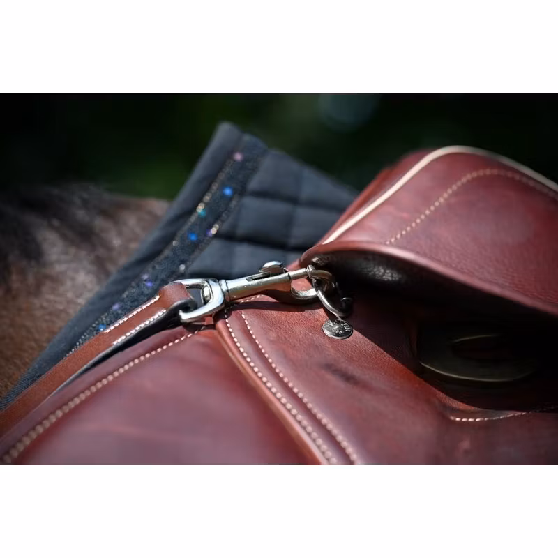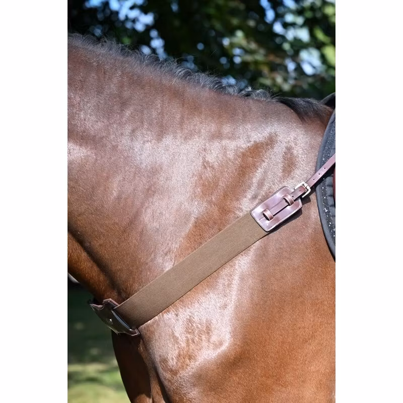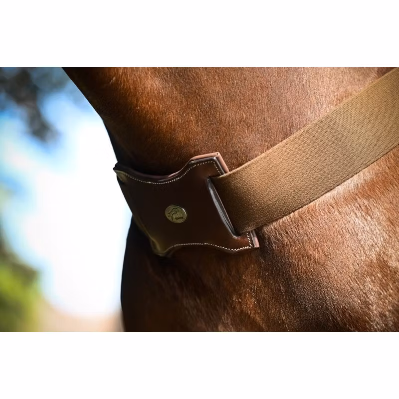 The Jump'In Elastic Breast Collar is placed on the horse's breast. It is attached with two snap hooks to the saddle so it doesn't move further back. It is made of a large elastic band with a leather center piece. Each end of the breast collar is composed by a leather strap for adjustment and a snap hook to attach to the rings at the front of the saddle.