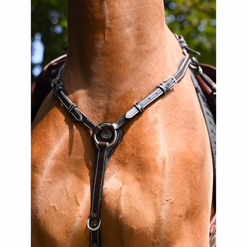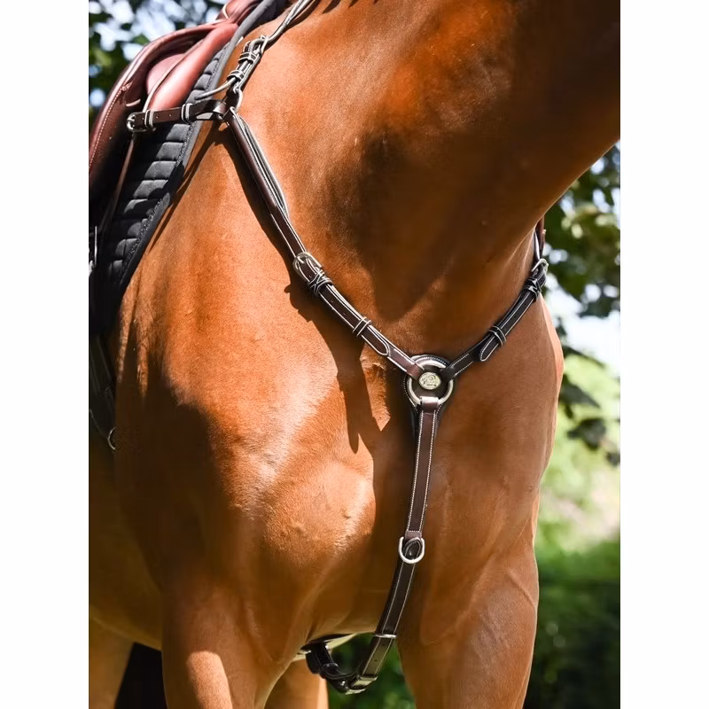 Matching the Wednesday Bridle with the little contrasting fancy and the patent lining, the breastplate must be attached to the girth straps. The breastplate helps keeping the saddle in place during a whole session so it doesn't shift back on the horse's back.