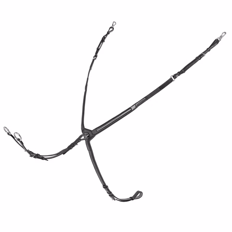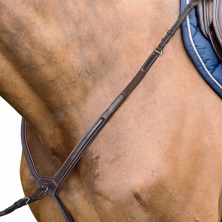 En anatomisk och elegant tvåpunkts brösta med upphöjd profilering och snygga sömmar. Den anatomiska formen utformades för bättre tryckfördelning. Bröstan är mjukt vadderad och är anatomiskt formad för bättre tryckfördelning. Supersmart snabbspänne på martingalen, så man inte behöver knäppa upp tyglarna för att trä igenom ringen, utan bara hakar på ringen på tyglarna!