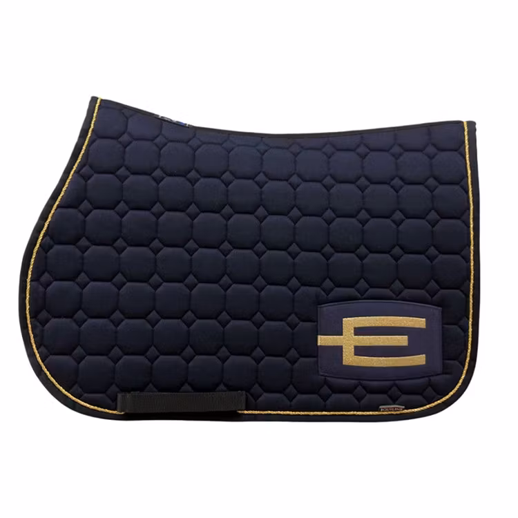Hoppschabrak i klassiskt marinblå med guld-glittrig passpoal 3 mm, och den populära E-loggan i marin-guld på vänster sidan. Octagon-quiltat schabrak i allergivänlig och antikrymp-behandlad bomull med insida i extra mjuk bomull. Insidan är i ofärgad ecru för att förhindra att färgnings-substanser kommer i kontakt med hästen. 900 gr stoppning i bomulls-ull med hög andasfunktion. Materialvalet och sammansättningen av de olika lagren ger en bra stötdämpning och ventilering.