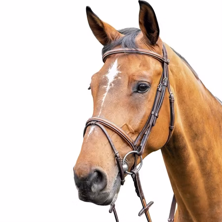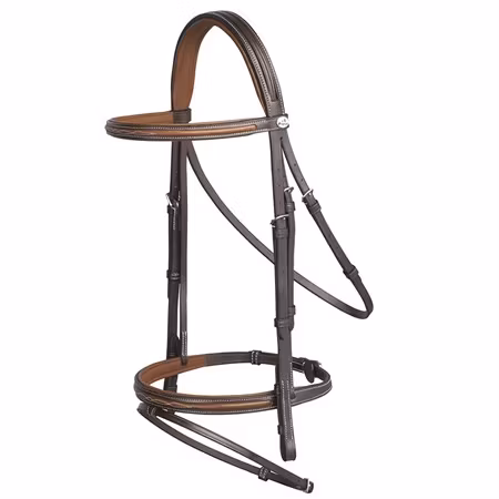 Elegant träns med kombinerad nosgrimma.Nosgrimman har ett elevator-system som innebär att nosgrimman löper igenom nackstycket och ger hästen en bekvämare känsla.Pannband, nosgrimma och nackstycke är fodrade i mjukt läder.Tränset är elegant designat med vit mönstersöm och inslag av ljusare läder på pannband och nosgrimma.