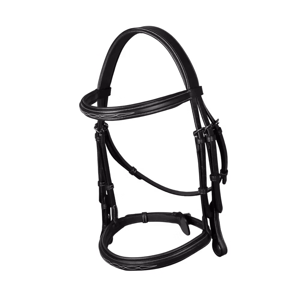 Cavesson Nosgrims-träns med Dy'on tre-bands huvudstycke Något fyrkantigt upphöjt nosgrimma och pannband med dekorativa stickningar Pannband utan stoppning med varmstämplad logotyp Cavesson nosgrimma