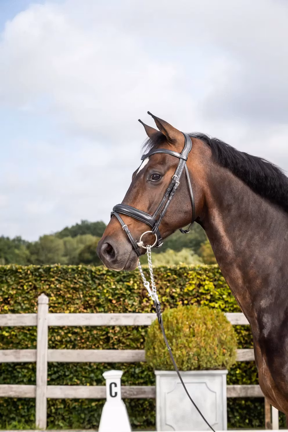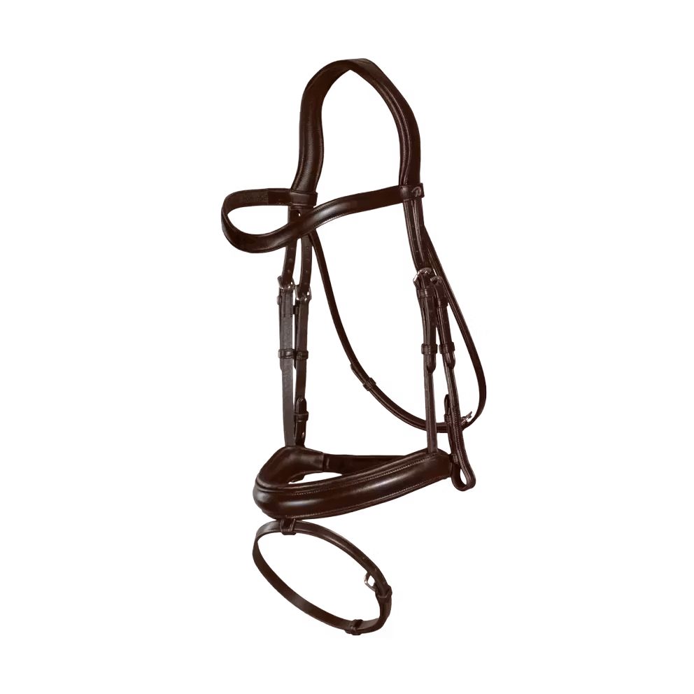 Matt medium nosgrimma träns med blixt Något upphöjt smidigt V-format pannband. Smidigt anatomiskt 28 mm brett nosgrimma finns endast i matt läder. Stängs av ett