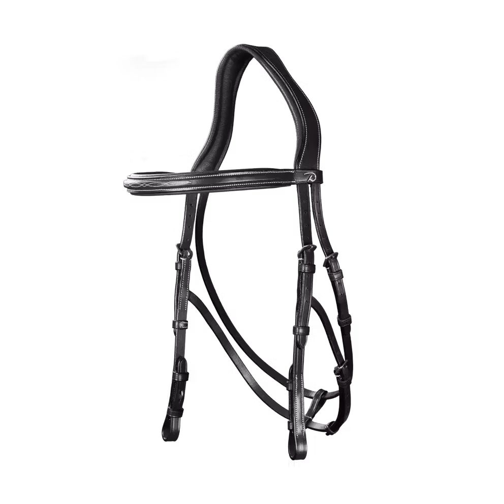 Träns för hackamore med silverspännen i spanskt läder. Nackstycket är S-format för att att få bort trycket från öronen. Hackamore-sidostycken med justerbar rem vid käkbenet. Fodrat squareraised pannband. Inåtvända spännen.