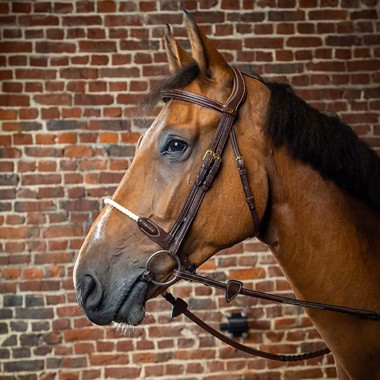 Sportigt träns i spanskt läder med repnosgrimma. Repet är tillverkat av tre vaxade rep som är tvinade. Nackstycket är S-format för att att få bort trycket från öronen. Vita sömmar och mässingspännen.
