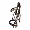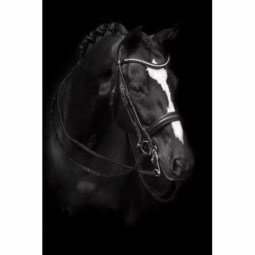Lyxigt rundsytt kandar. Anatomiskt mjukt fodrad nosgrimma och nackstycke. Svängt fodrat pannband med glittriga stenar. Tillverkat i amerikanskt läder. Inkl. dubbla tyglar