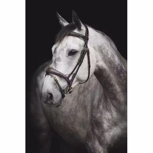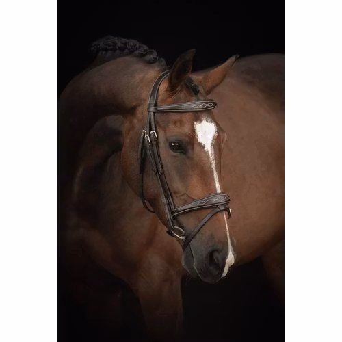 Tillverkat i förstklassigt amerikanskt läder. Anatomiskt fodrat nackstycke. Fodrad nosgrimma och pannband med dekorativa stickningar. Rostfria söljor.