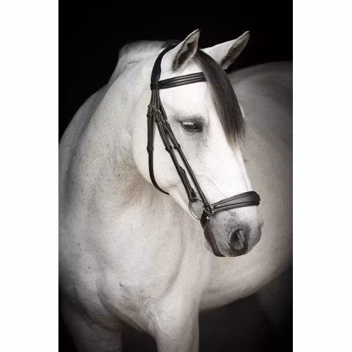 Exklusivt träns tillverkat i mjukt förstklassigt amerikanskt läder. Smalt utformat fodrat nackstycke för mindre tryck bakom öronen. Hannoveransk nosgrimma med mjukt foder. Rostfria söljor.