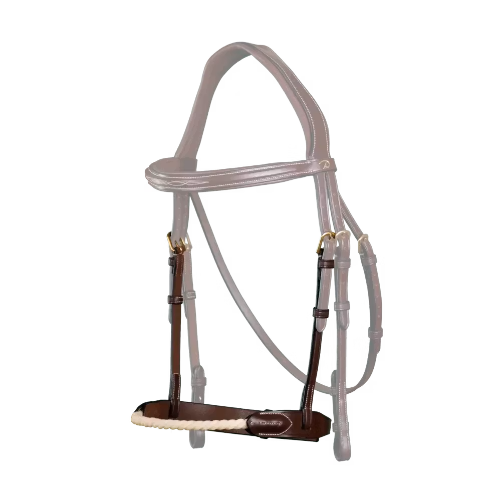 Rep bestående av tre vaxade tvinnade trådar Smal rad tillbakadragande stängning monterad på ett mjukt vadderat skyddande läderunderlag Detta är ett träningsnosgrimma som är designat för korta rörelser och får inte sitta åt. För att kontrollera att den sitter korrekt måste du kunna glida två fingrar mellan nosgrimman och hästens nos. Kompatibel med huvudstycken i D Collection