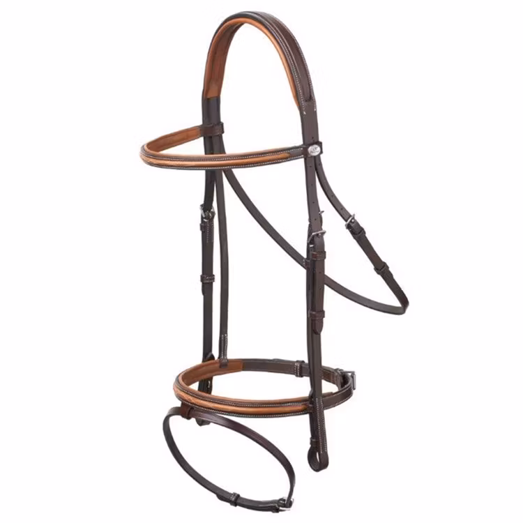 Elegant träns med kombinerad nosgrimma.Nosgrimman har ett elevator-system som innebär att nosgrimman löper igenom nackstycket och ger hästen en bekvämare känsla.Pannband, nosgrimma och nackstycke är fodrade i mjukt läder.Tränset är elegant designat med vit mönstersöm och inslag av ljusare läder på pannband och nosgrimma.