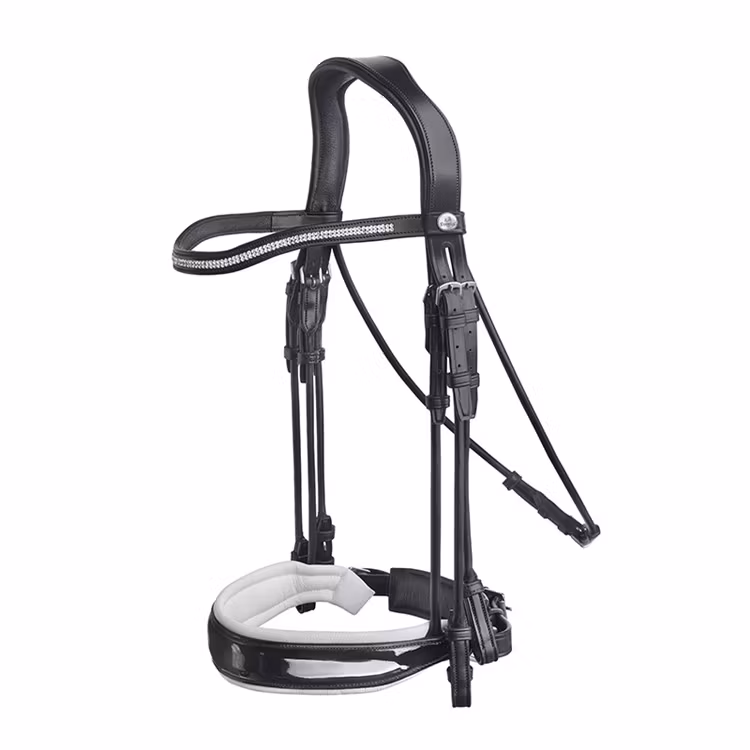 Kandar tillverkat av högkvalitativt europeiskt läder. Det anatomiskt formade nackstycket har en bred yta och en extra stoppning i mjukt läder för att minska trycket på det känsligaste området på hästens nacke. Kandaret kommer med två eleganta pannband: ena är utsmyckat med en rad Swarovski-stenar och det andra är med lackad läder. Pullback lackad nosgrimma med vit fodring. Matchande tyglar 3E136/3E138 ingår.