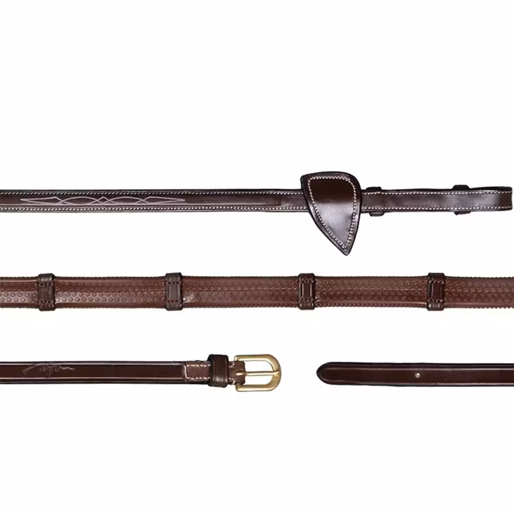Gummitygel med stoppar i fint spanskt läder med inåtvänt spänne. Vit mönstersöm, mässingspänne och läckert designade martingalstoppar.