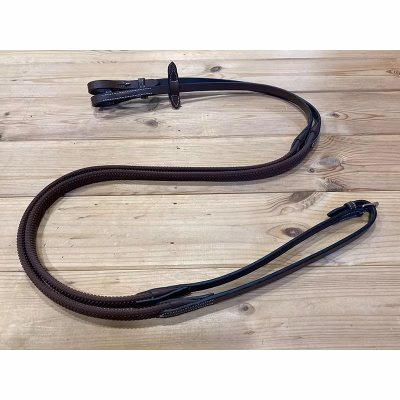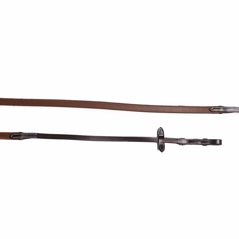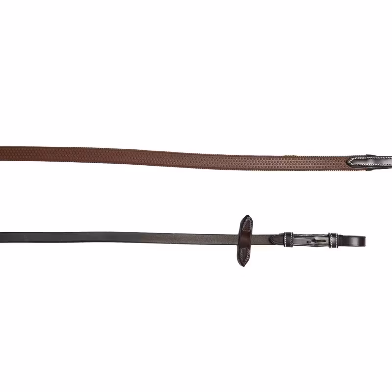 Thin high-quality leather and rubber reins matching all the Week Collection bridles and all the leather colors. They are attached to the bit with leather straps that close towards the inside for more safety so the buckles stay discreet and are linked to one another with a classic buckle.