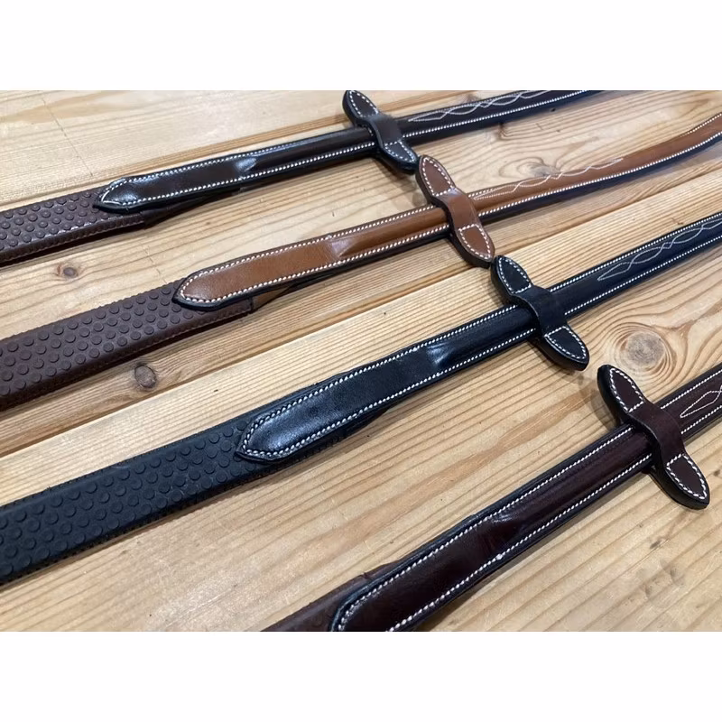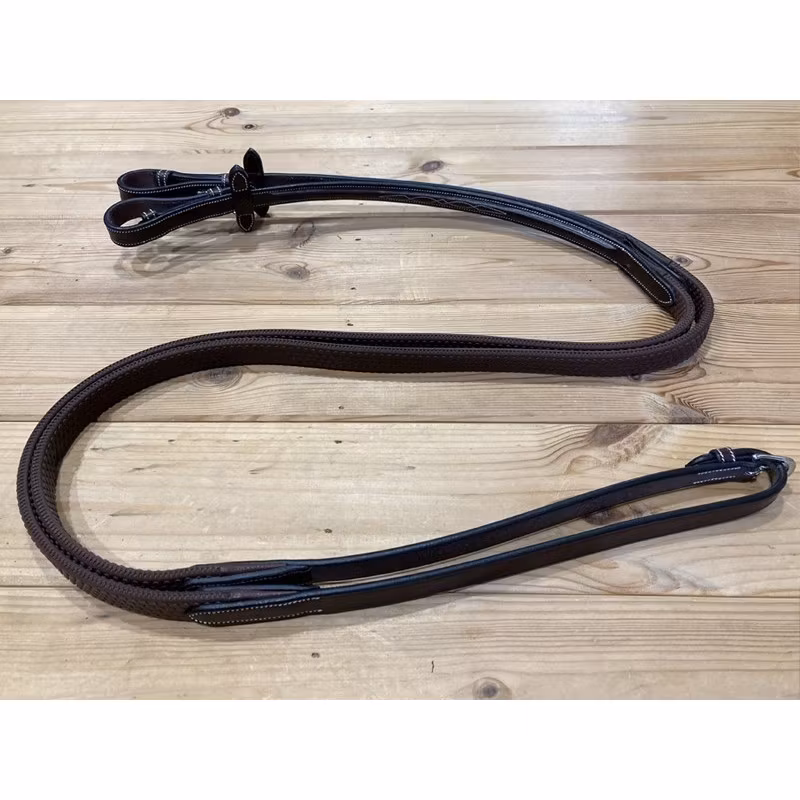 High-quality leather and rubber reins matching the Jump'In Monday Bridle (available HERE). The ends are slightly rounded and enhanced by the main feature of this model: a thin fancy. They are attached to the bit with leather straps that close towards the inside so the buckles stay discreet.