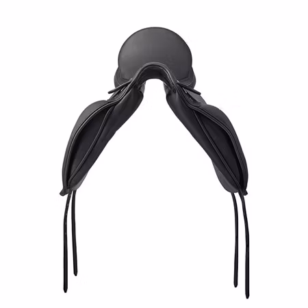 En elegant och tidlös dressyrsadel i dubbelt läder med djupt säte och stora, högt uppsatta klossar. Bommen är normal mot svängd och panelerna är ullstoppade.