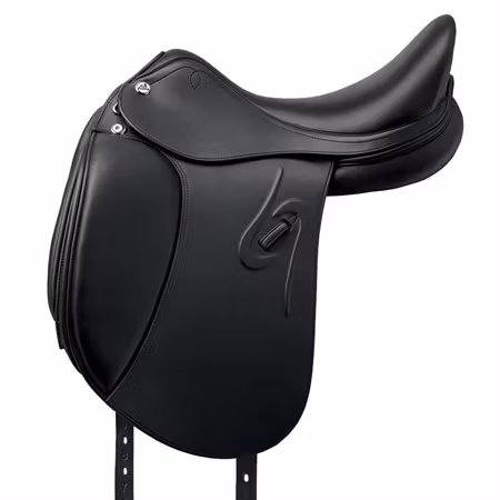 Dressyrsadel med dubbla kåpor. Djupt säte och stora anatomiska klossar som ger benet en korrekt position. Vattenavstötande Lux-läder för bästa grepp. Ullstoppad.