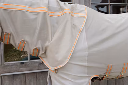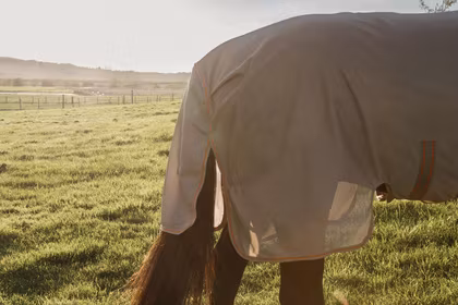 The fly rug is made from a dense structured mesh fabric, which keeps most bugs off. The mesh is extremely strong and will be an ideal field companion for many summers. The fabric is flat on the inside, this has a soft feeling and makes sure that no hairs will stick to the rug. Thanks to the light color of the rug, it will reflect the sunrays and does not absorb heat. The fine mesh still allows air permeability. The mane, chest and tail area are lined with a smooth polyester to avoid rubbing.
