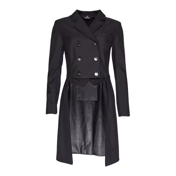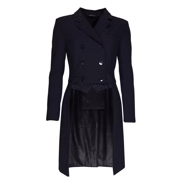 Denna showfrack kombinerar sömlöst högkvalitativ prestanda med en oslagbar estetik. Vi har designat den i ett lätt, stretchigt tyg som gör att du kan röra dig utan ansträngning eftersom vi hade den högsta nivån av ridsport i åtanke. Alla sömmar invändigt är snyggt fodrade med satinpiping, vilket bidrar till dess raffinerade utseende. Frackens glitter kommer från de glänsande kristallerna som pryder kragen, västen och ryggvecken. De fångar ljuset på ett vackert sätt och ger varje rörelse en touch av glamour. Och låt oss inte glömma en viktig funktion som garanterar din eleganta framtoning på arenan. Vi har fodrat den inre delen av fracken med konstläder och sytt in vikter i nederkanten. Detta säkerställer att fracken sitter perfekt på plats under ditt framträdande. Finns i tidlöst svart eller marinblått och är det senaste tillskottet i Kingsland Classic-kollektionen.