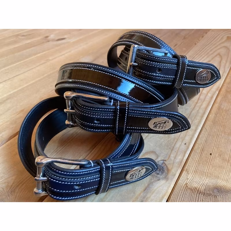 Women's belt made of patent leather embellished with a contrasting topstitch.