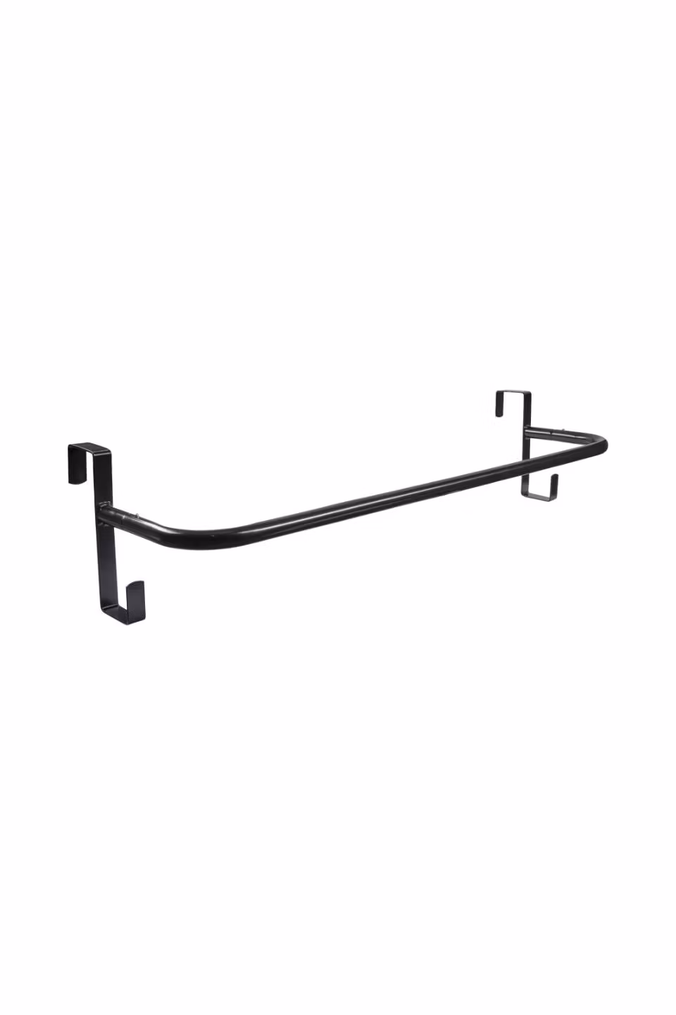 Svart täckeshängare med fast längd designat av en stark belagd metall. Krokfästen för att fästa över en vägg eller dörr. Tjock stång för att bära vikten av flera täcken och djup projektion för att hantera skrymmande material. Praktiska ändkrokar för upphängning av en mängd olika stabila föremål.