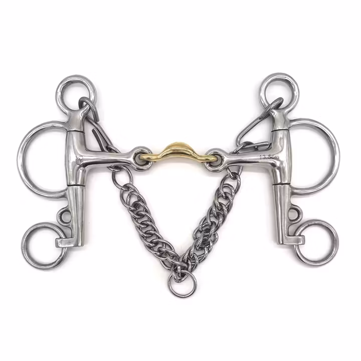 Denna vackert utformade bett har tre delar inklusive en kopparkvartsmånlänk. Quarter moon-länken ger extra utrymme för hästens tunga vilket ger extra komfort för känsliga hästar. Pelham kinddelen ger ryttaren ytterligare hävstång och kontroll. Kopparkvartsmånen uppmuntrar salivutsöndring och uppmuntrar hästen att acceptera bettet. Det dubbelledade munstycket undviker nötknäpparens verkan av en enkel led, förhindrar att bettet träffar taket av munnen och ger föraren oberoende kontroll över varje sida av munnen.