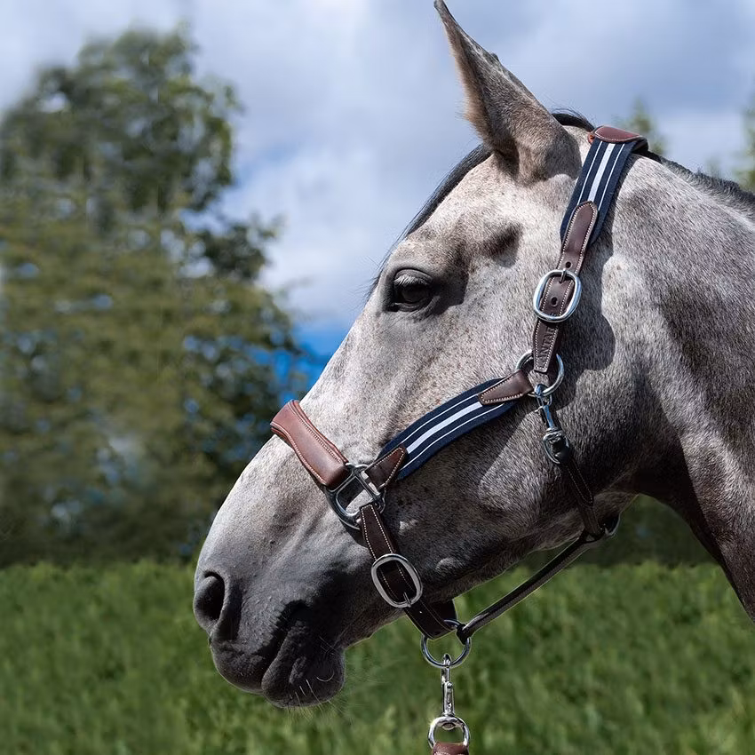 De kraftiga resårförstärkningarna på grimman är strategiskt placerade för att minimera så mycket som möjligt av “stop” effekten när hästen står uppbunden.