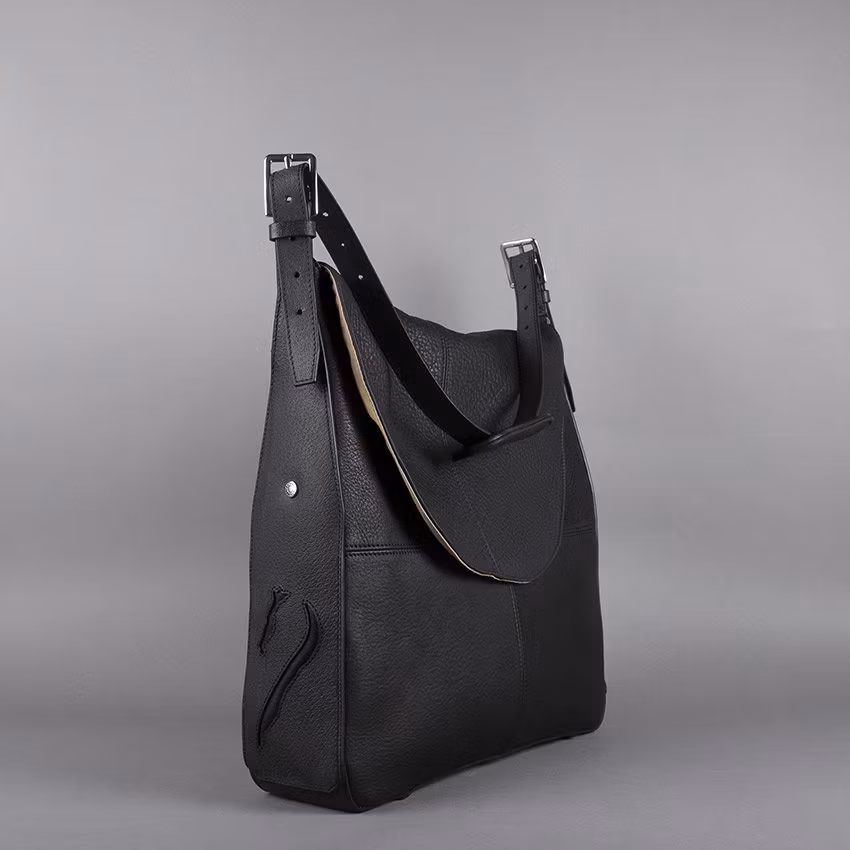 Läderväska med lock och axelband i härligt mjukt kalvskinn från Antarès sadelproduktion.