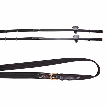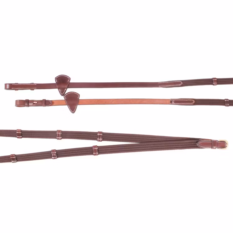 Vävribbstyglar med exklusivt italienskt läder, stoppar och vita sömmar. Martingalstroppar med vit söm och spännen i mässing.
