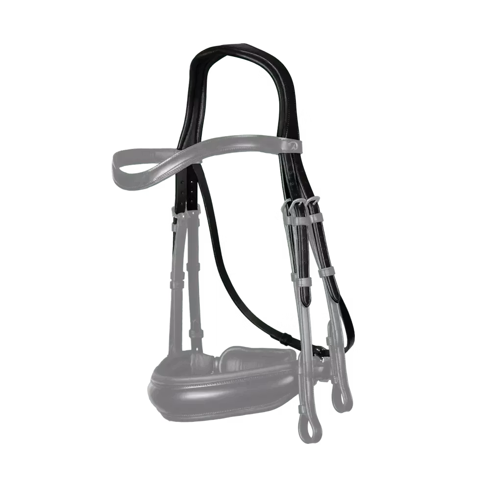 "Dressage" huvudstycke med dubbelt träns S-format huvudstycke – den senaste innovationen från Dy'on för dressyrkollektionen i platt läder med dubbelträns. Detta nya S-formade huvudstycke är en förbättring av modellen som du redan känner till. Skillnaden? S-formen har framhävts och pannbandet sitter lägre ner på huvudstycket för att inte krama om basen av örat – en av de känsliga fläckarna på din hästs huvud. Att accentuera S-formen gör det också möjligt att se konturerna av basen av örat utan att utöva tryck på den.Avelsmål och ridsport har förändrats avsevärt de senaste åren. Våra hästar är smidigare, lättare, smidigare, mer reaktiva och känsligare. Vi var skyldiga oss själva att anpassa våra produkter till dessa förändringar.