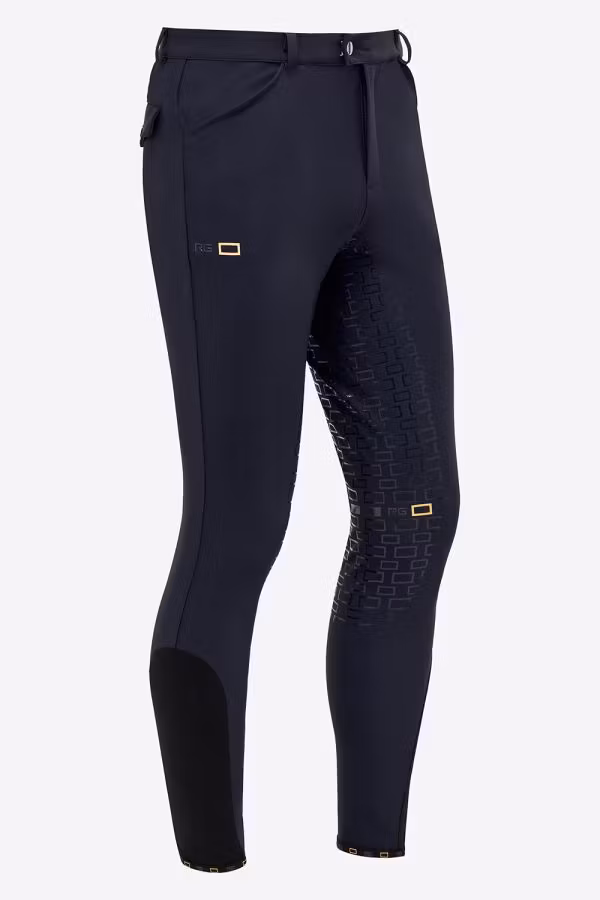 Dessa ridbyxor är gjorda av bi-stretch tekniskt tyg och har ett helt ton-i-ton-grepp för att säkerställa rätt passform på sadeln. Det speciella med denna modell är det grip inuti bältet, perfekt för att bättre fästa din skjorta. Den har en dragkedja framtill förstärkt med en dubbelknapp och breda öglor som kan bäras bekvämt med bältet. Strumpan i den sista delen av byxan sveper in vaden under stöveln och har en andningsfunktion. Den kontrasterande tryckta RG-logotypen finish ger plagget en modern look.Finns i olika färger.