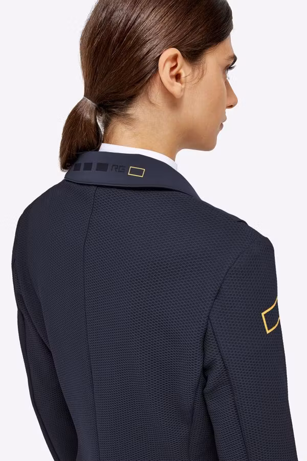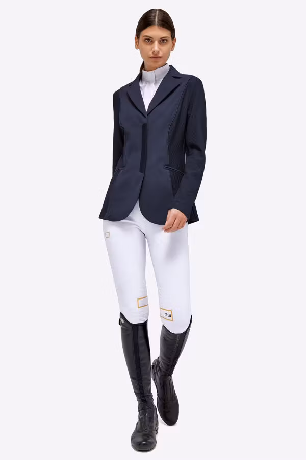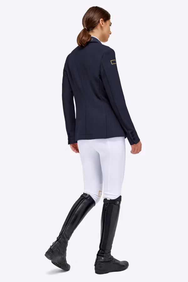 Det tekniska tyget med två stretch är både elegant och högpresterande: det främjar andningsförmågan och följer kroppens rörelser. Det är också vattenavvisande och har antibakteriella egenskaper. Jackan har två sidofickor och stängs av tre knappar med logga framtill. En präglad logotyp är präglad på axeln