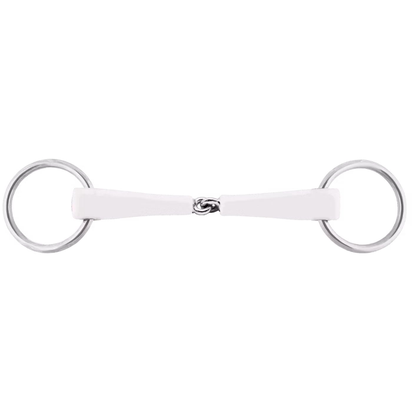 The NATHE loose ring snaffle is back with an upgrade! We have replaced the plastic joints with stainless steel and tilted them forward by 45° to prevent pressure on the palate. With single jointed bits, there is increased pressure on the edges of the tongue when the reins are taken up and the middle of the tongue is relieved. The high-quality thermoplastic has a smooth surface, is food-safe and free from plasticizers and solvents. Thermoplastic is also temperature-neutral, which makes the bit comfortable for the horse even in cold temperatures.