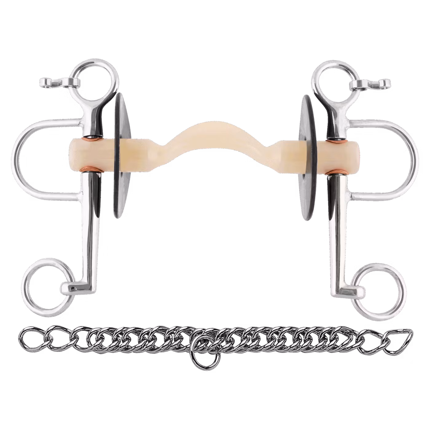 This bit's tongue clearance and short tongues provide maximum comfort. In particular, the sensitive centre of the tongue is relieved. On this model, the bit guards also help to protect the corners of the mouth.
