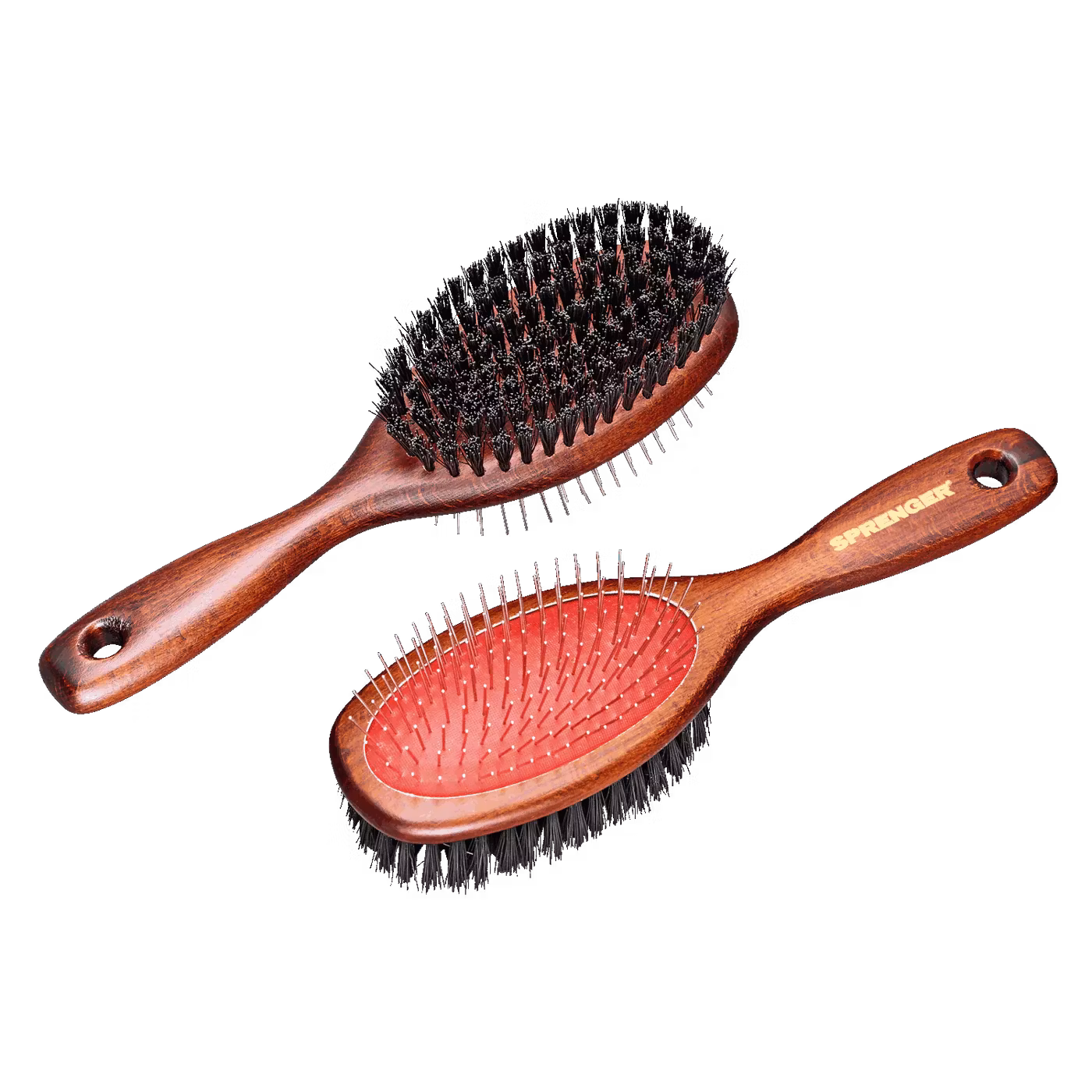 one side black nylon bristles, reverse side rounded pins on rubber cushion