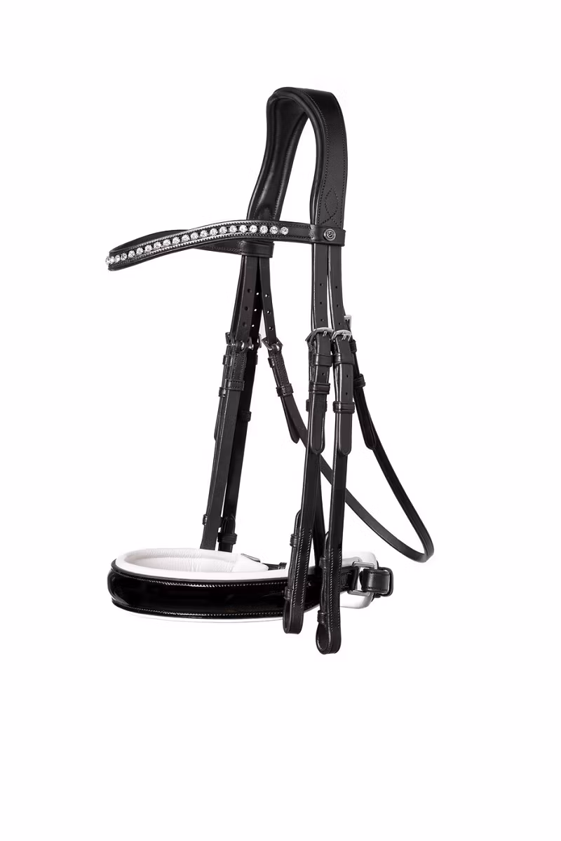 TRUST Aachen dubbelträns är i en klass för sig. Detta eleganta träns har en vacker finish och passform. TRUST Aachen har ett anatomiskt pannband i lack som är förstärkt med nylon för att förhindra att det sträcker sig. Nosgrimsstoppningen sträcker sig utanför nosgrimman så att spännena aldrig rör vid hästens huvud. Pannbandet har Stellux™-stenar av finaste kvalitet som ger ett elegant utseende. Stenarna är djupt liggande så att de inte faller ut. Huvudstycket är anatomiskt format och avskuret för att ge mer frihet vid öronen. Vadderingen är mjuk men inte för tjock så att direktkontakt med hästen bibehålls. TRUST Aachen är ett måste för alla dressyrryttare! TRUST Aachen är tillverkad av europeiskt fullnarvsläder av högsta kvalitet, som är slätt och smidigt och blir ännu bättre med tiden. Tack vare sin överlägsna kvalitet är TRUST Aachen byggd för att hålla. Alla aspekter av designen tar hänsyn till den moderna hästens anatomi. Dessa funktioner säkerställer att TRUST Aachen erbjuder en perfekt passform. • TRUST Aachen har en subtil TRUST-logotyp på huvudstycket och pannbandet. • TRUST Aachen är förpackad i två unika handdukar. • TRUST Aachen finns i svart med silverspännen eller med en vit vadderad nosgrimma. • Alla spännen är nickelpläterade i mässing för att förhindra rost.
