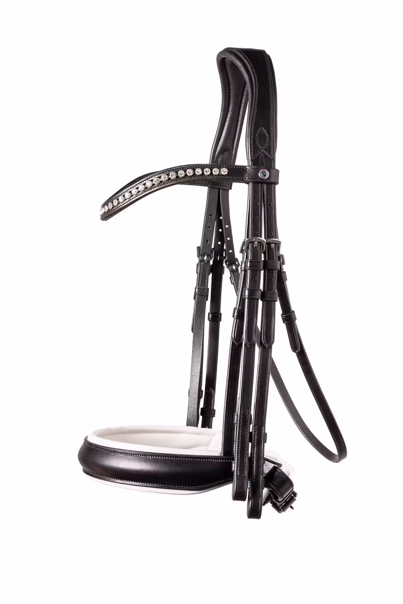 TRUST Wellington dubbelträns är i en klass för sig. Detta eleganta träns har en vacker finish och passform. TRUST Wellington har ett anatomiskt pannband förstärkt med nylon för att förhindra att det sträcker sig. Nosgrimsstoppningen sträcker sig utanför nosgrimman så att spännena aldrig rör vid hästens huvud. Pannbandet har Stellux™-stenar av finaste kvalitet som ger ett elegant utseende. Stenarna är djupt liggande så att de inte faller ut. Huvudstycket är anatomiskt format och avskuret för att ge mer frihet vid öronen. Vadderingen är mjuk men inte för tjock så att direktkontakt med hästen bibehålls. TRUST Wellington är ett måste för alla dressyrryttare! TRUST Wellington är tillverkad av europeiskt fullnarvsläder av högsta kvalitet, som är slätt och smidigt och blir ännu bättre med tiden. Tack vare sin överlägsna kvalitet är TRUST Wellington byggd för att hålla. Alla aspekter av designen tar hänsyn till den moderna hästens anatomi. Dessa funktioner säkerställer att TRUST Wellington erbjuder en perfekt passform. • TRUST Wellington har en subtil TRUST-logotyp på huvudstycket och pannbandet. • TRUST Wellington är förpackad i två unika handdukar. • TRUST Wellington finns i svart med silverspännen eller med en vit vadderad nosgrimma. • Alla spännen är nickelpläterade i mässing för att förhindra rost.